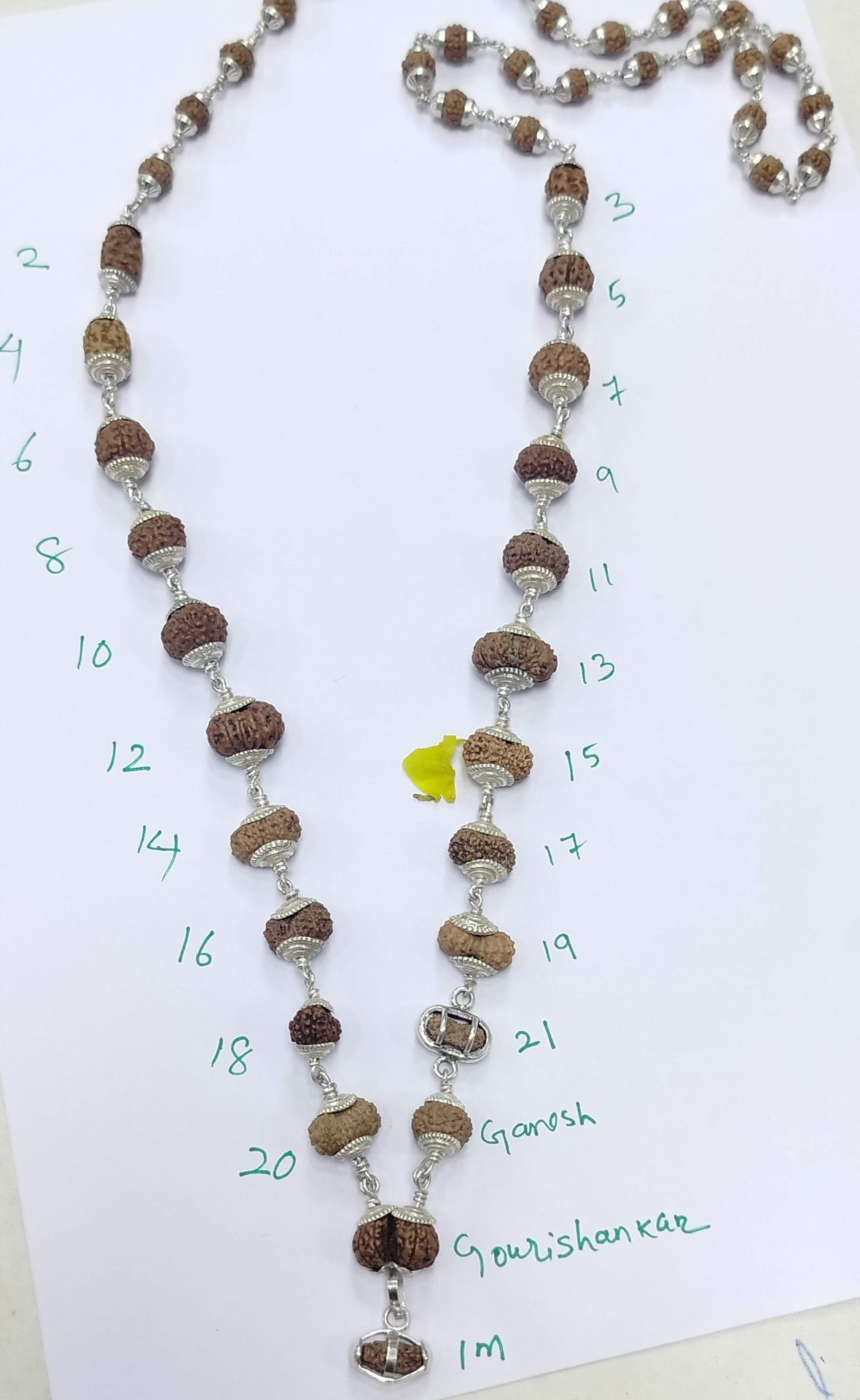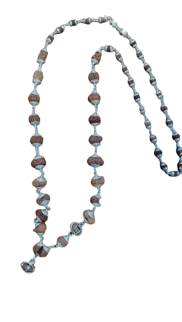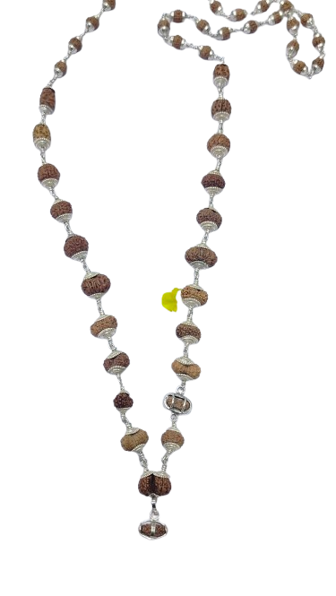 Experience the ultimate spiritual journey with our Indrakshi Mala, featuring 1 Mukhi to 21 Mukhi Indonesian Rudraksha, Gauri Shankar, and Ganesha Rudraksha, all strung on pure silver wire with silver capping.