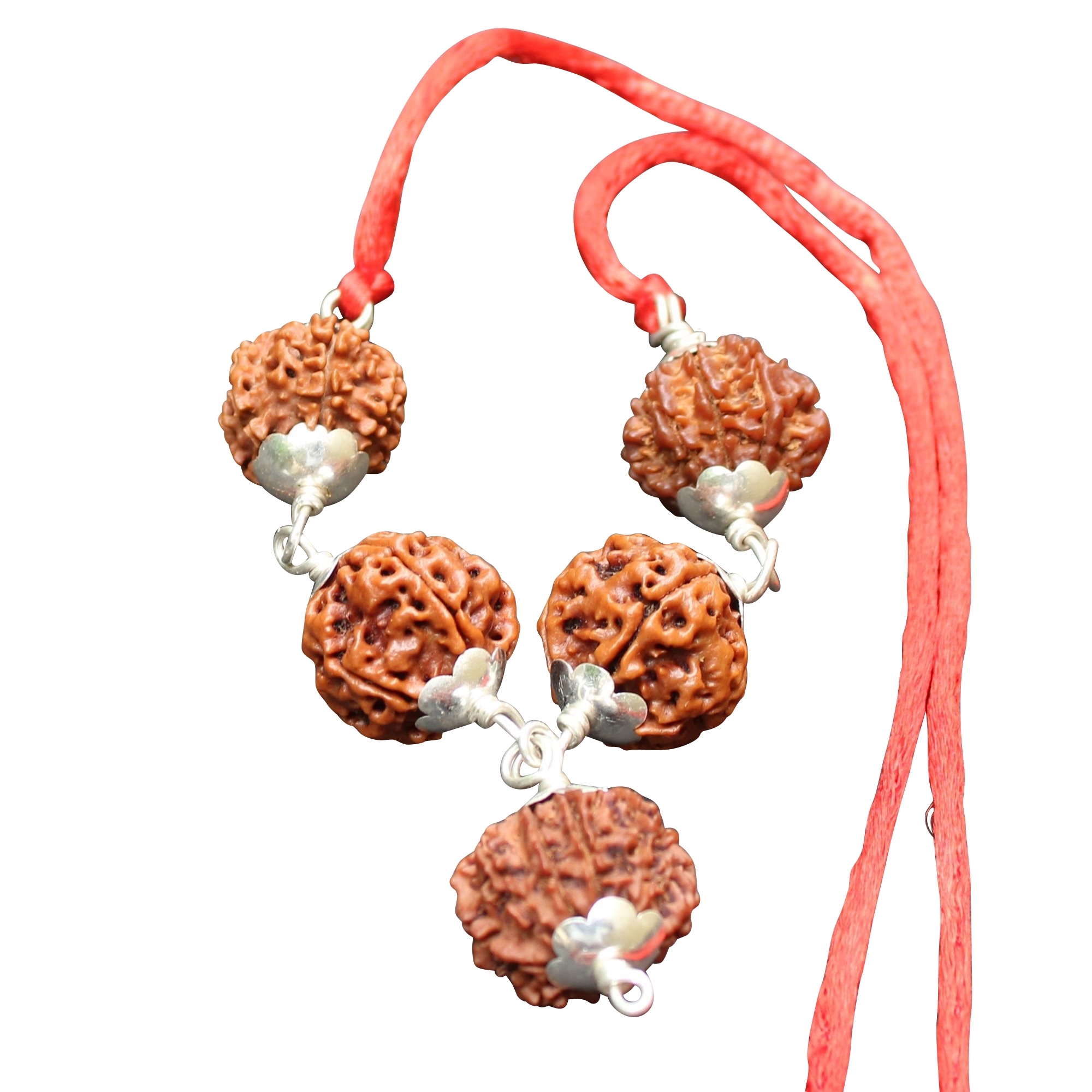 The five rudraksha beads are strung in the way the image is shown and are attached to best quality silk-cotton thread of red color.